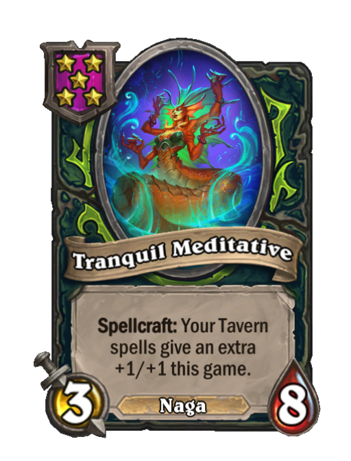 Tranquil Meditative is a Tier 5 Naga Minion in Hearthstone Battlegrounds with 3/8 stats featuring Spellcraft. Effect: Spellcraft: Your Tavern spells give an extra +1/+1 this game.