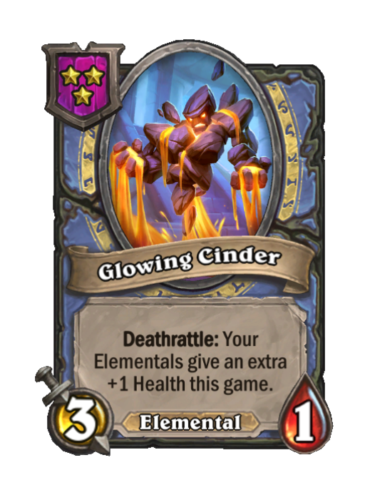 Glowing Cinder is a Tier 3 Elemental Minion in Hearthstone Battlegrounds with 3/1 stats featuring Deathrattle. Effect: Deathrattle: Your Elementals give an extra +1 Health this game. This card is no longer in the pool (Legacy).