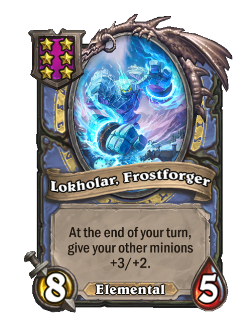 Lokholar, Frostforger is a Tier 6 Elemental Minion in Hearthstone Battlegrounds with 8/5 stats featuring End of Turn. Effect: At the end of your turn, give your other minions +3/+2. This card is no longer in the pool (Legacy).