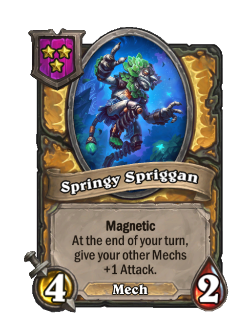 Springy Spriggan is a Tier 3 Mech Minion in Hearthstone Battlegrounds with 4/2 stats featuring End of Turn, Magnetic. Effect: Magnetic At the end of your turn, give your other Mechs +1 Attack. This card is no longer in the pool (Legacy).