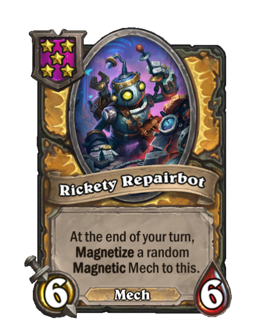 Rickety Repairbot is a Tier 5 Mech Minion in Hearthstone Battlegrounds with 6/6 stats featuring End of Turn. Effect: At the end of your turn, Magnetize a random ___Magnetic Mech to this. This card is no longer in the pool (Legacy).