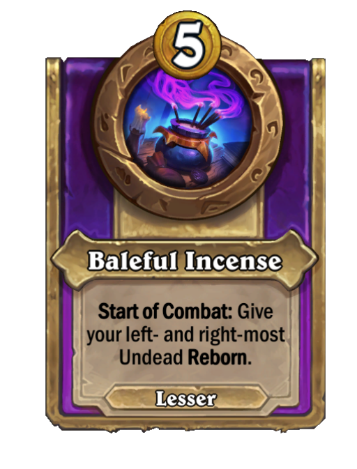 Baleful Incense is a Trinket in Hearthstone Battlegrounds featuring Start of Combat. Effect: Start of Combat: Give your left- and right-most Undead Reborn.