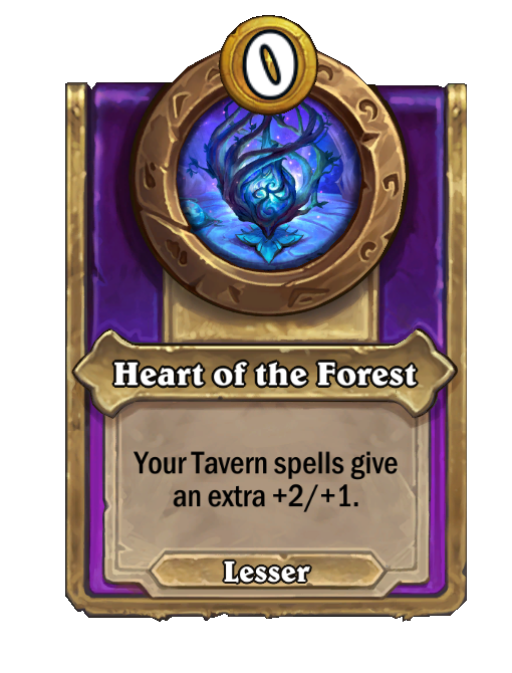 Heart of the Forest is a Trinket in Hearthstone Battlegrounds featuring Aura. Effect: Your Tavern spells give an extra +2/+1.