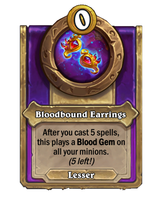 Bloodbound Earrings is a Trinket in Hearthstone Battlegrounds. Effect: After you cast 5 spells, this plays a Blood Gem on all your minions. (5 left!).