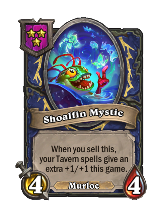 Shoalfin Mystic is a Tier 3 Murloc Minion in Hearthstone Battlegrounds with 4/4 stats. Effect: When you sell this, your Tavern spells give an ___extra +1/+1 this game.