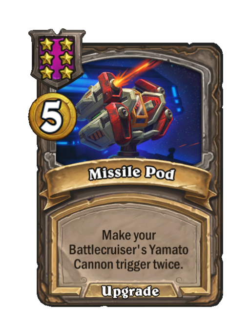 Missile Pod is a Tier 6 Spell in Hearthstone Battlegrounds (Battlecruiser). Effect: Make your Battlecruiser's Yamato Cannon trigger twice. Costs 5 Gold.