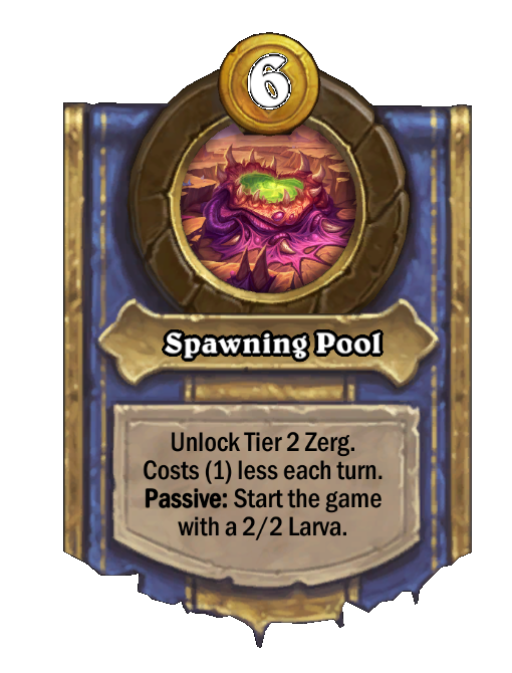 Spawning Pool is a Hero Power in Hearthstone Battlegrounds. Effect: Unlock Tier 2 Zerg. Costs (1) less each turn. Passive: Start the game with a 2/2 Larva. Costs 6 Gold. Created by: Kerrigan, Queen of Blades.