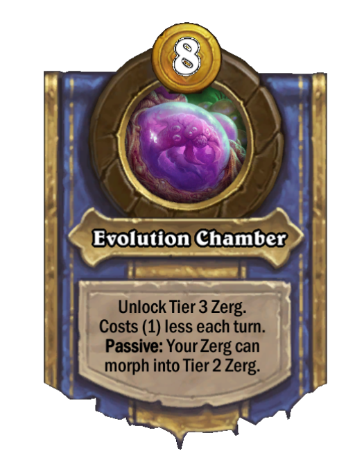 Evolution Chamber is a Hero Power in Hearthstone Battlegrounds. Effect: Unlock Tier 3 Zerg. Costs (1) less each turn. Passive: Your Zerg can morph into Tier 2 Zerg. Costs 8 Gold. Created by: Spawning Pool.