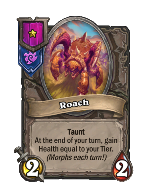 Roach is a Tier 1 Minion in Hearthstone Battlegrounds with 2/2 stats featuring Taunt, End of Turn. Effect: Taunt At the end of your turn, gain Health equal to your Tier. (Morphs each turn!). Created by: Spawning Pool.