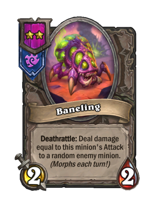 Baneling is a Tier 2 Minion in Hearthstone Battlegrounds with 2/2 stats featuring Deathrattle. Effect: Deathrattle: Deal damage equal to this minion's Attack to a random enemy minion. (Morphs each turn!). Created by: Spawning Pool.