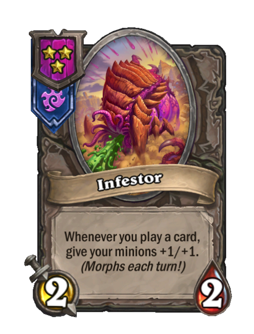 Infestor is a Tier 3 Minion in Hearthstone Battlegrounds with 2/2 stats. Effect: Whenever you play a card, give your minions +1/+1. (Morphs each turn!). Created by: Spawning Pool.