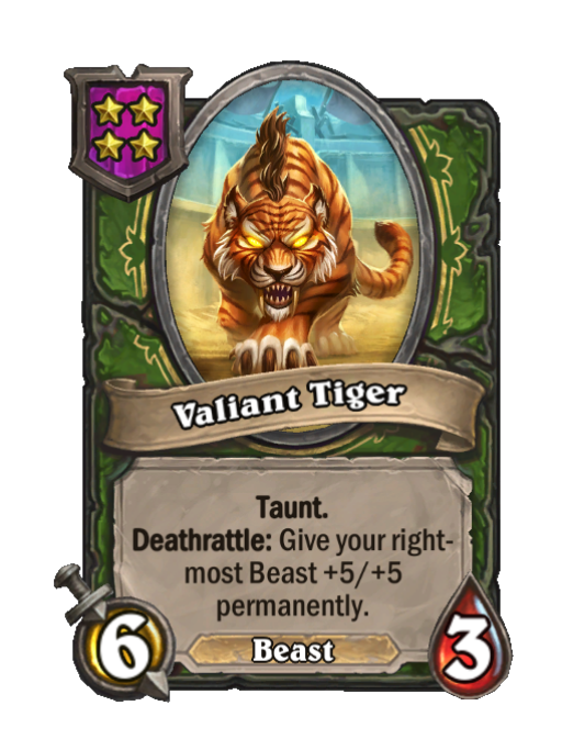 Valiant Tiger is a Tier 4 Beast Minion in Hearthstone Battlegrounds with 6/3 stats featuring Taunt, Deathrattle. Effect: Taunt. Deathrattle: Give your right-most Beast +5/+5 permanently. This card is no longer in the pool (Legacy).