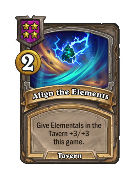 Align the Elements is a Tier 4 Spell in Hearthstone Battlegrounds (Tavern). Effect: Give Elementals in the Tavern +3/+3 this game. Costs 2 Gold. This card is no longer in the pool (Legacy).