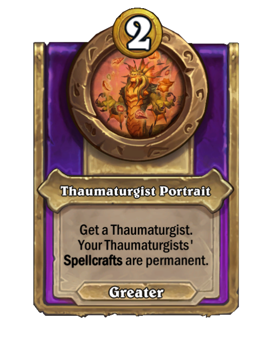 Thaumaturgist Portrait is a Trinket in Hearthstone Battlegrounds. Effect: Get a Thaumaturgist. Your Thaumaturgists' Spellcrafts are permanent. This card is no longer in the pool (Legacy).
