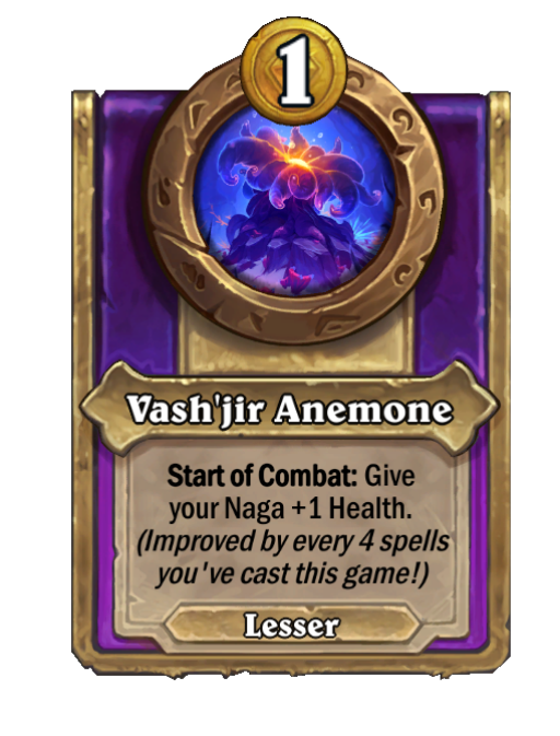 Vash'jir Anemone is a Trinket in Hearthstone Battlegrounds featuring Start of Combat. Effect: Start of Combat: Give your Naga +1 Health. (Improved by every 4 spells you've cast this game!). This card is no longer in the pool (Legacy).