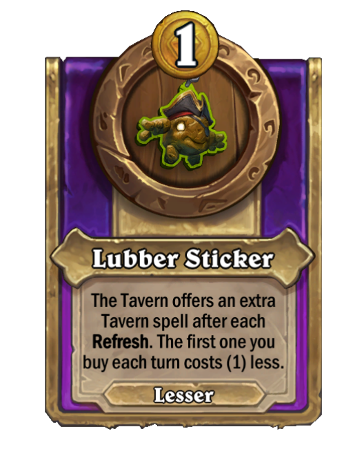 Lubber Sticker is a Trinket in Hearthstone Battlegrounds featuring Refresh. Effect: The Tavern offers an extra Tavern spell after each Refresh. The first one you buy each turn costs (1) less. This card is no longer in the pool (Legacy).