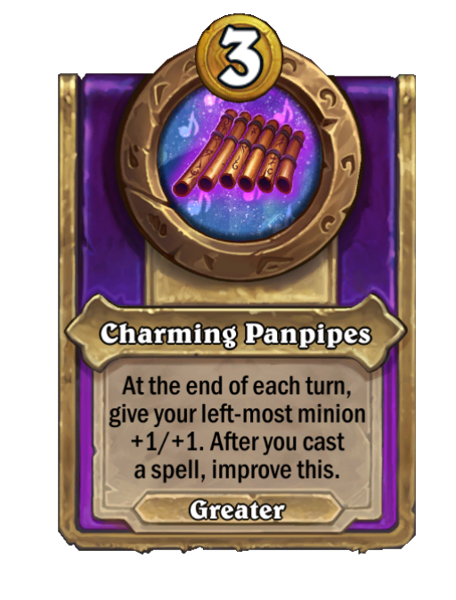 Charming Panpipes is a Trinket in Hearthstone Battlegrounds featuring End of Turn. Effect: At the end of each turn, give your left-most minion +1/+1. After you cast a spell, improve this.