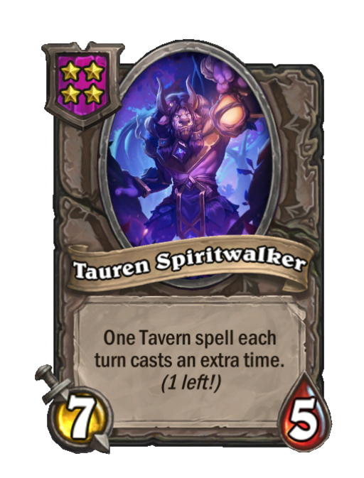 Tauren Spiritwalker is a Tier 4 Minion in Hearthstone Battlegrounds with 7/5 stats. Effect: One Tavern spell each turn casts an extra time. (1 left!). This card is no longer in the pool (Legacy).