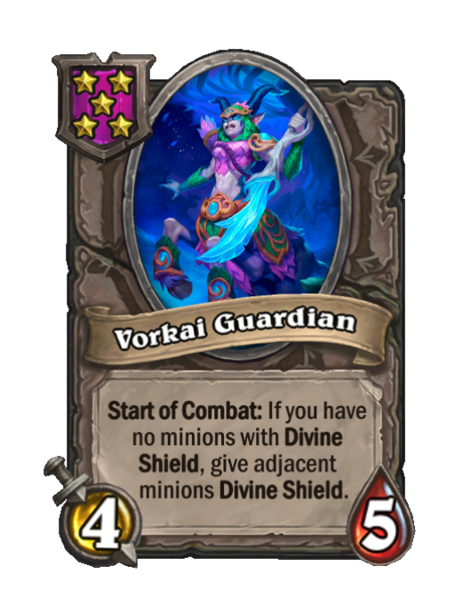 Vorkai Guardian is a Tier 5 Minion in Hearthstone Battlegrounds with 4/5 stats featuring Start of Combat. Effect: Start of Combat: If you have no minions with Divine Shield, give adjacent ___minions Divine Shield. This card is no longer in the pool (Legacy).