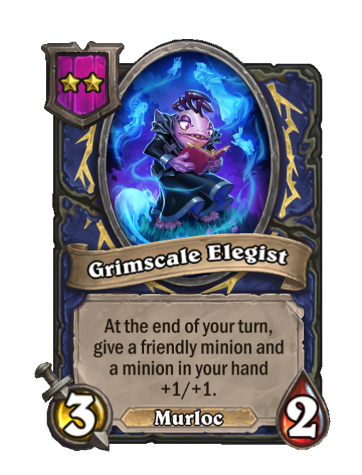 Grimscale Elegist is a Tier 2 Murloc Minion in Hearthstone Battlegrounds with 3/2 stats featuring End of Turn. Effect: At the end of your turn, give a friendly minion and a minion in your hand +1/+1. This card is no longer in the pool (Legacy).