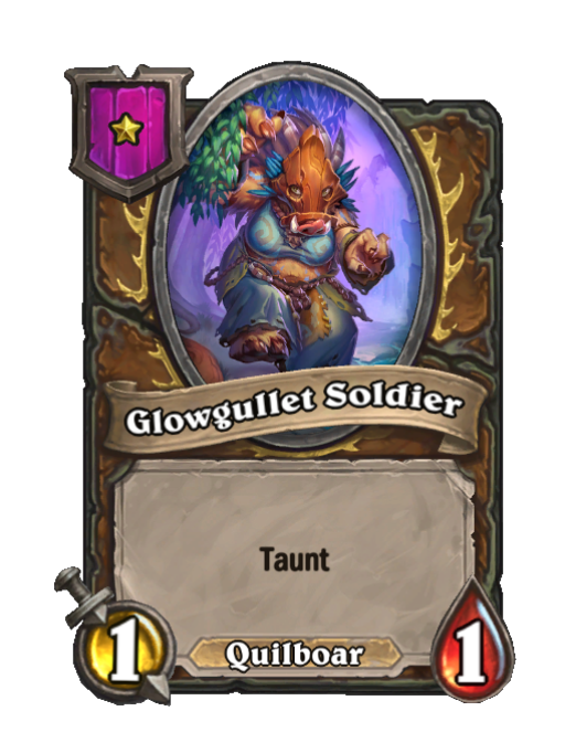 Glowgullet Soldier is a Tier 1 Quilboar Minion in Hearthstone Battlegrounds with 1/1 stats featuring Taunt. Effect: Taunt. Created by: Glowgullet Warlord. This card is no longer in the pool (Legacy).