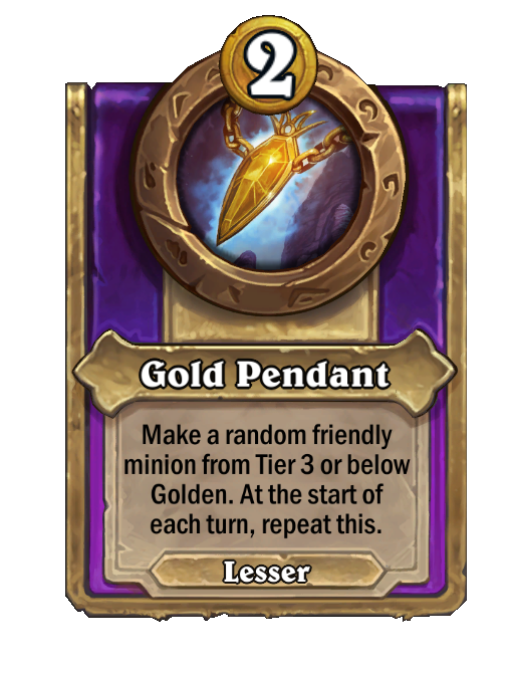 Gold Pendant is a Trinket in Hearthstone Battlegrounds. Effect: Make a random friendly minion from Tier 3 or below Golden. At the start of each turn, repeat this.
