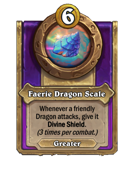 Faerie Dragon Scale is a Trinket in Hearthstone Battlegrounds. Effect: Whenever a friendly Dragon attacks, give it Divine Shield. (3 times per combat.).