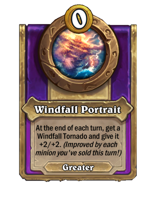 Windfall Portrait is a Trinket in Hearthstone Battlegrounds featuring End of Turn. Effect: At the end of each turn, get a Windfall Tornado and give it +2/+2. (Improved by each minion you've sold this turn!). This card is no longer in the pool (Legacy).