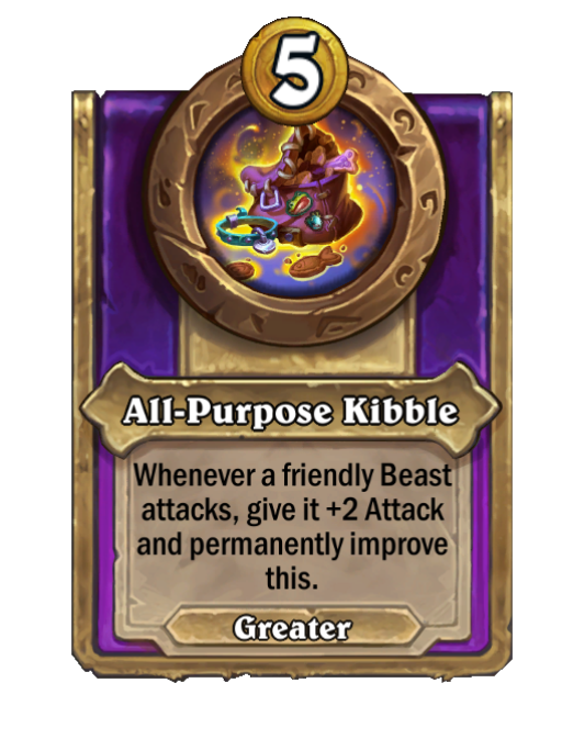 All-Purpose Kibble is a Trinket in Hearthstone Battlegrounds. Effect: Whenever a friendly Beast attacks, give it +2 Attack and permanently improve this.