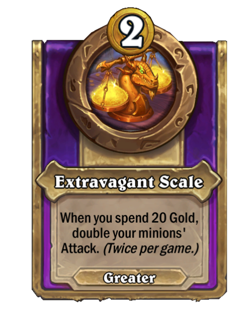 Extravagant Scale is a Trinket in Hearthstone Battlegrounds. Effect: When you spend 20 Gold, double your minions' Attack. (Twice per game.). This card is no longer in the pool (Legacy).