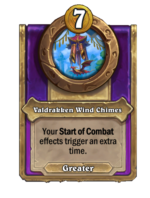 Valdrakken Wind Chimes is a Trinket in Hearthstone Battlegrounds featuring Aura. Effect: Your Start of Combat effects trigger an extra time.