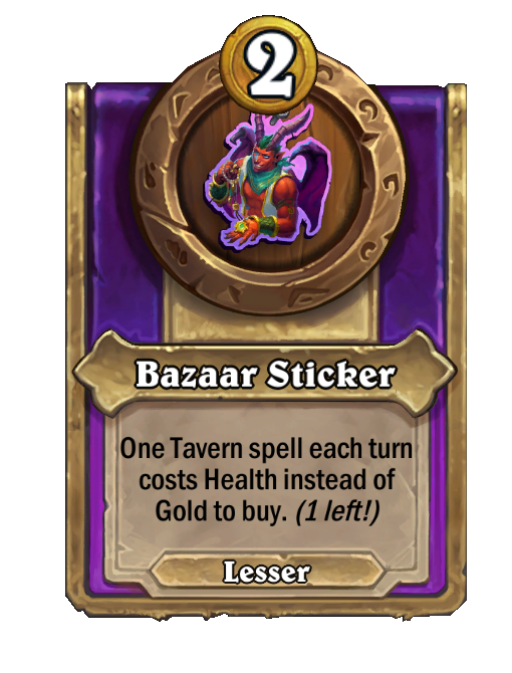 Bazaar Sticker is a Trinket in Hearthstone Battlegrounds. Effect: One Tavern spell each turn costs Health instead of Gold to buy. (1 left!). This card is no longer in the pool (Legacy).
