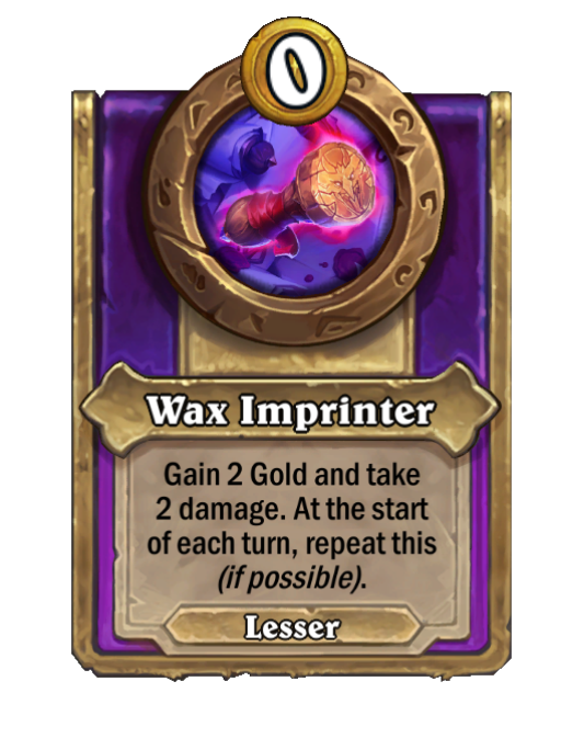 Wax Imprinter is a Trinket in Hearthstone Battlegrounds. Effect: Gain 2 Gold and take 2 damage. At the start of each turn, repeat this (if possible). This card is no longer in the pool (Legacy).