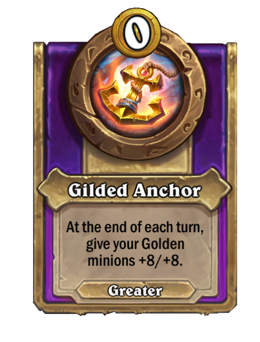 Gilded Anchor is a Trinket in Hearthstone Battlegrounds featuring End of Turn. Effect: At the end of each turn, give your Golden minions +8/+8.