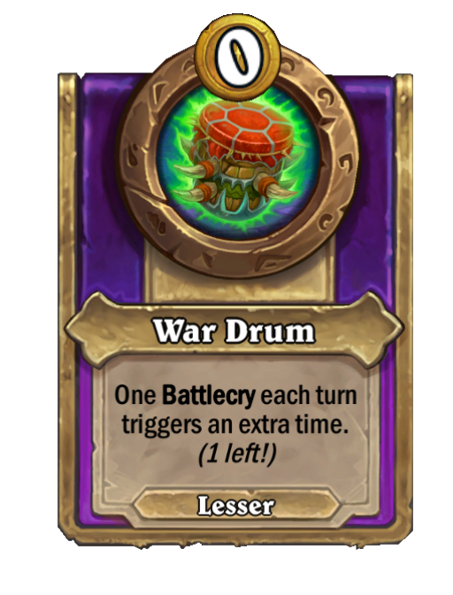 War Drum is a Trinket in Hearthstone Battlegrounds. Effect: One Battlecry each turn triggers an extra time. (1 left!).