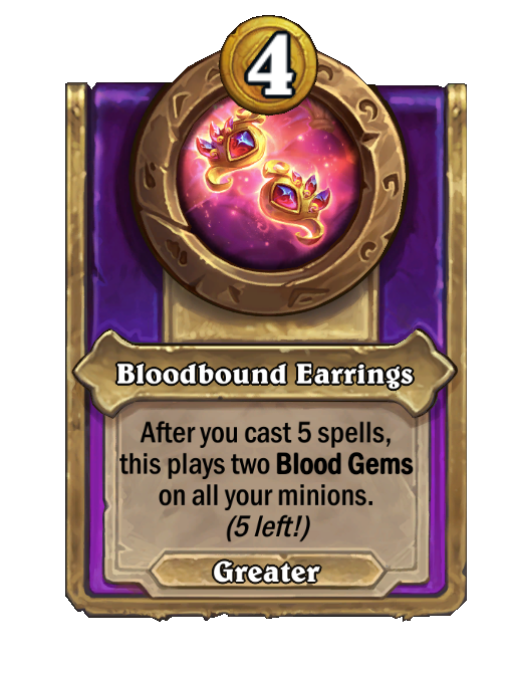 Bloodbound Earrings is a Trinket in Hearthstone Battlegrounds. Effect: After you cast 5 spells, this plays two Blood Gems on all your minions. (5 left!).