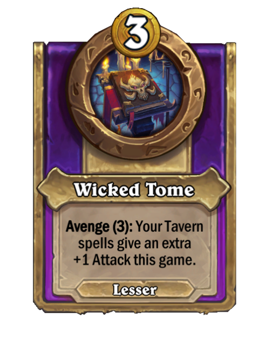 Wicked Tome is a Trinket in Hearthstone Battlegrounds featuring Avenge. Effect: Avenge (3): Your Tavern spells give an extra +1 Attack this game. This card is no longer in the pool (Legacy).
