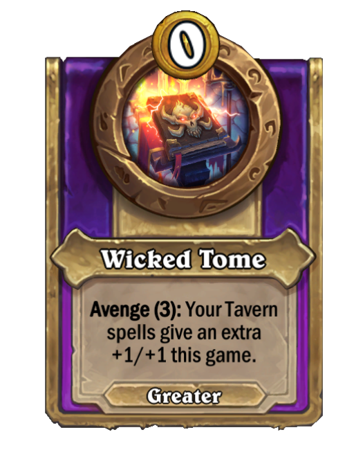 Wicked Tome is a Trinket in Hearthstone Battlegrounds featuring Avenge. Effect: Avenge (3): Your Tavern spells give an extra +1/+1 this game.