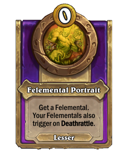 Felemental Portrait is a Trinket in Hearthstone Battlegrounds. Effect: Get a Felemental. Your Felementals also trigger on Deathrattle. This card is no longer in the pool (Legacy).