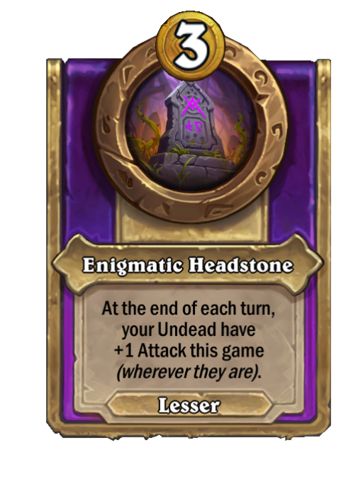 Enigmatic Headstone is a Trinket in Hearthstone Battlegrounds featuring End of Turn. Effect: At the end of each turn, your Undead have +1 Attack this game (wherever they are).