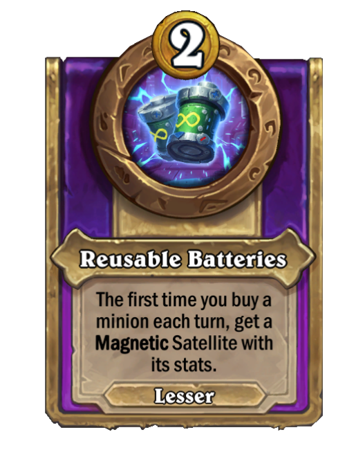 Reusable Batteries is a Trinket in Hearthstone Battlegrounds. Effect: The first time you buy a minion each turn, get a Magnetic Satellite with its stats. This card is no longer in the pool (Legacy).