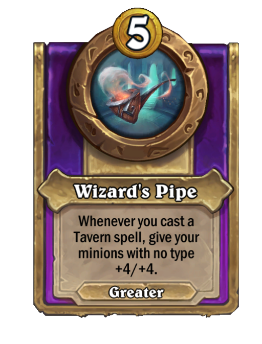 Wizard's Pipe is a Trinket in Hearthstone Battlegrounds. Effect: Whenever you cast a Tavern spell, give your minions with no type +4/+4.