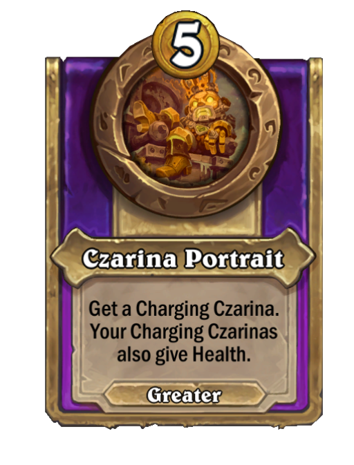 Czarina Portrait is a Trinket in Hearthstone Battlegrounds featuring Aura. Effect: Get a Charging Czarina. Your Charging Czarinas also give Health. This card is no longer in the pool (Legacy).