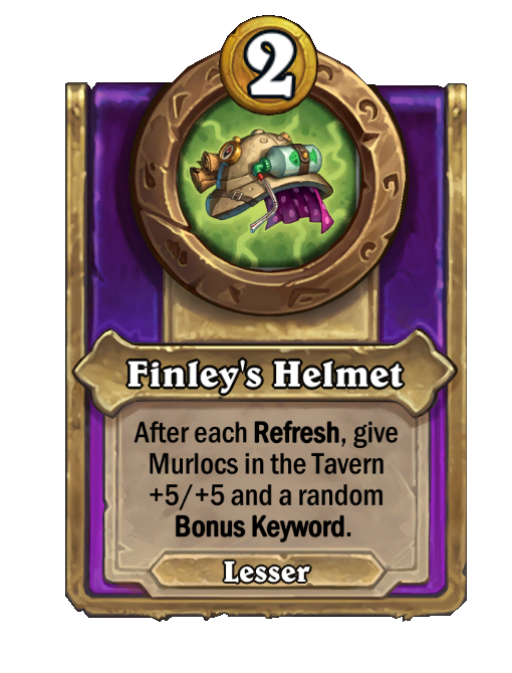 Finley's Helmet is a Trinket in Hearthstone Battlegrounds featuring Refresh. Effect: After each Refresh, give Murlocs in the Tavern +5/+5 and a random Bonus Keyword. This card is no longer in the pool (Legacy).