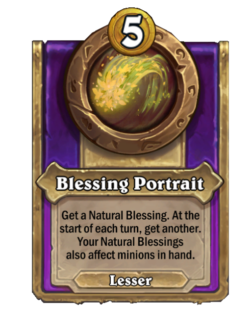 Blessing Portrait is a Trinket in Hearthstone Battlegrounds featuring Aura. Effect: Get a Natural Blessing. At the start of each turn, get another. Your Natural Blessings also affect minions in hand.