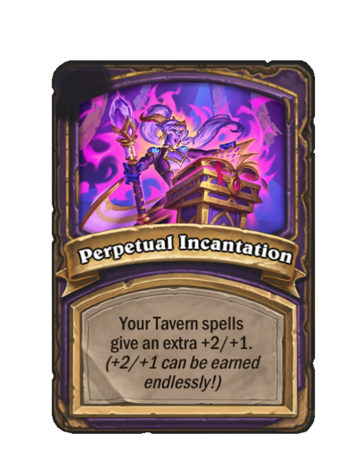 Perpetual Incantation is a Reward in Hearthstone Battlegrounds featuring Aura. Effect: Your Tavern spells give an extra +2/+1. (+2/+1 can be earned endlessly!).