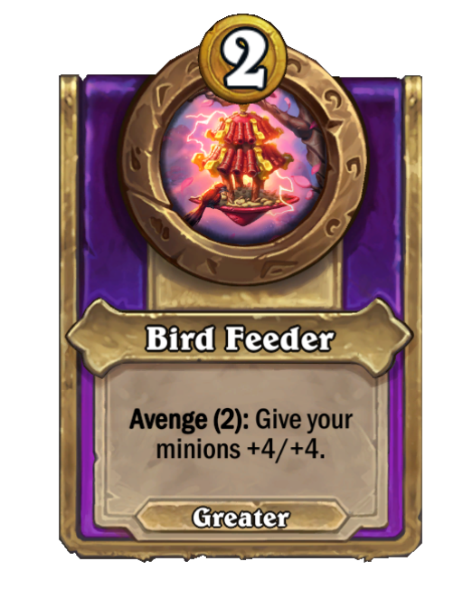 Bird Feeder is a Trinket in Hearthstone Battlegrounds featuring Avenge. Effect: Avenge (2): Give your minions +4/+4.