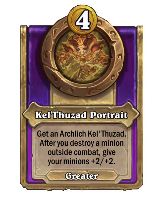 Kel'Thuzad Portrait is a Trinket in Hearthstone Battlegrounds. Effect: Get an Archlich Kel'Thuzad. After you destroy a minion outside combat, give your minions +2/+2. This card is no longer in the pool (Legacy).