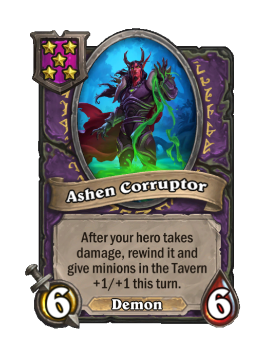 Ashen Corruptor is a Tier 5 Demon Minion in Hearthstone Battlegrounds with 6/6 stats. Effect: After your hero takes damage, rewind it and give minions in the Tavern +1/+1 this turn.