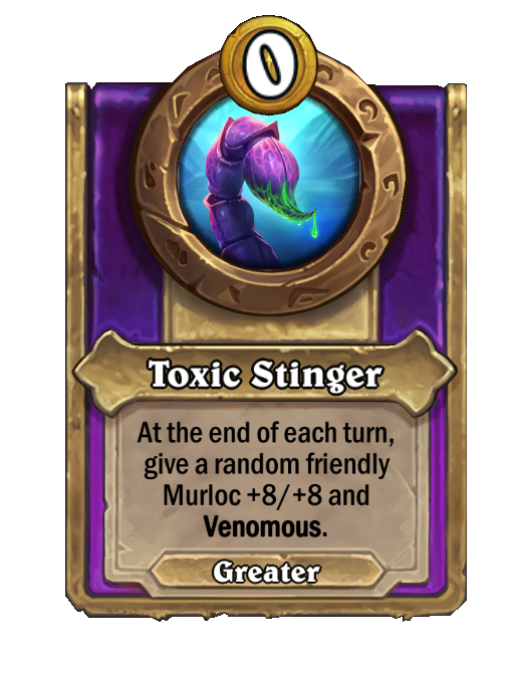 Toxic Stinger is a Trinket in Hearthstone Battlegrounds featuring End of Turn. Effect: At the end of each turn, give a random friendly Murloc +8/+8 and Venomous.
